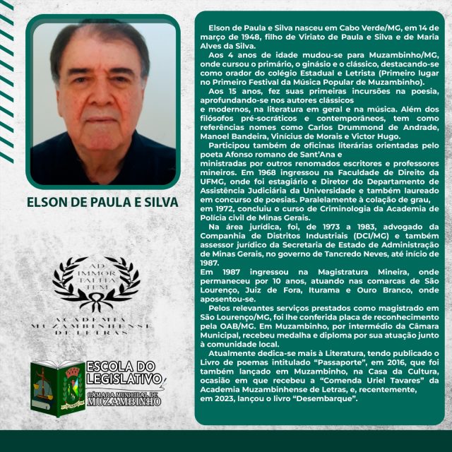 Elson de Paula e Silva construiu sua trajetória literária de forma notável, percorrendo os caminhos da educação desde os primeiros anos. Ao cursar o primário, o ginásio e o clássico em Muzambinho, destacou-se como orador do Colégio Estadual. Já aos 15 anos, fez suas primeiras incursões na poesia, revelando seu talento precoce para as letras.