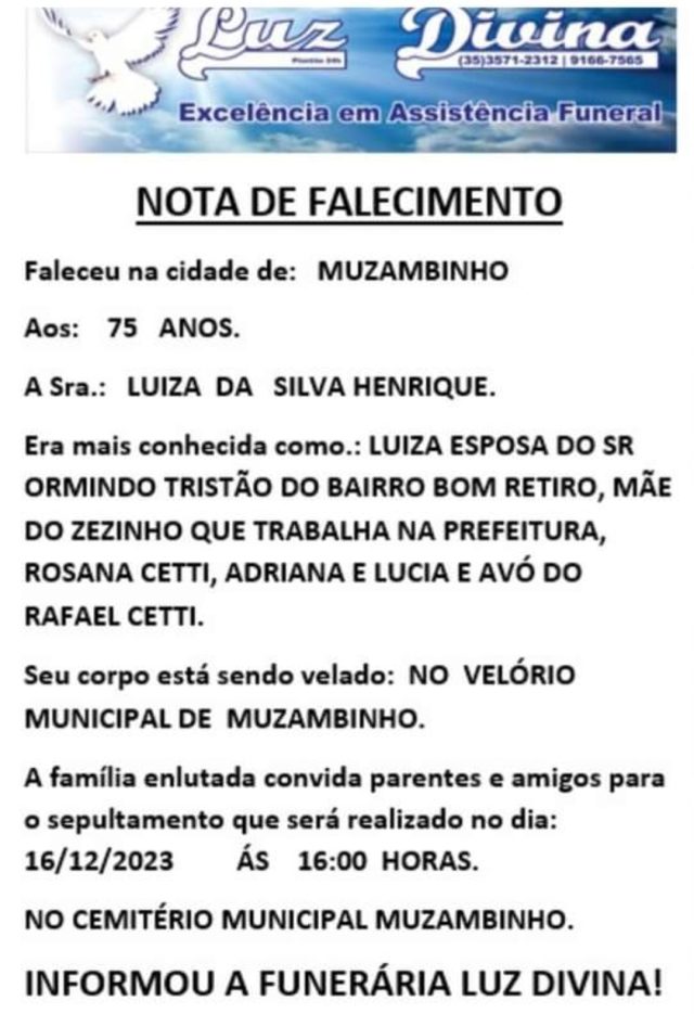 Mais Artigos DestaqueEsportesEventos e FestasNossa Cidade 1ª Corrida Amor Azul mobiliza comunidade em Muzambinho e reforça conscientização sobre o autismo AgronegócioDestaqueEducaçãoNossa Cidade ENCONTEC 2026 movimenta Muzambinho com inovação, tecnologia e integração entre comunidade e estudantes DestaqueObituário Faleceu aos 69 anos a Sra. Aparecida Alves Ribeiro LopesDestaqueObituárioFaleceu aos 75 anos, a Sra. Luiza da Silva Henrique Redação16 de dezembro de 20231min0Informou a Funerária Luz DivinaA família enlutada, nossos sinceros sentimentos de pesares, que Deus os abençoe e conforte. Post Views: 869EnterroFuneráriaLuz DivinamorteobituárioSepultamentoVelório