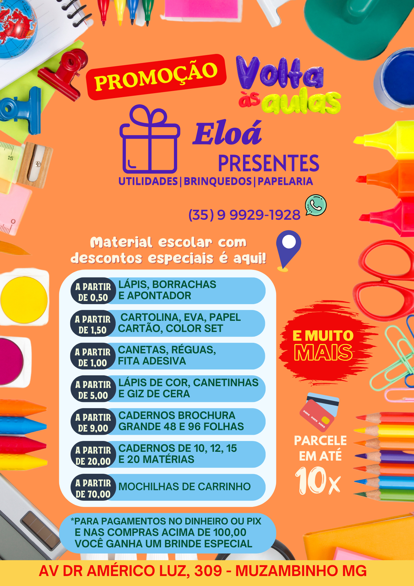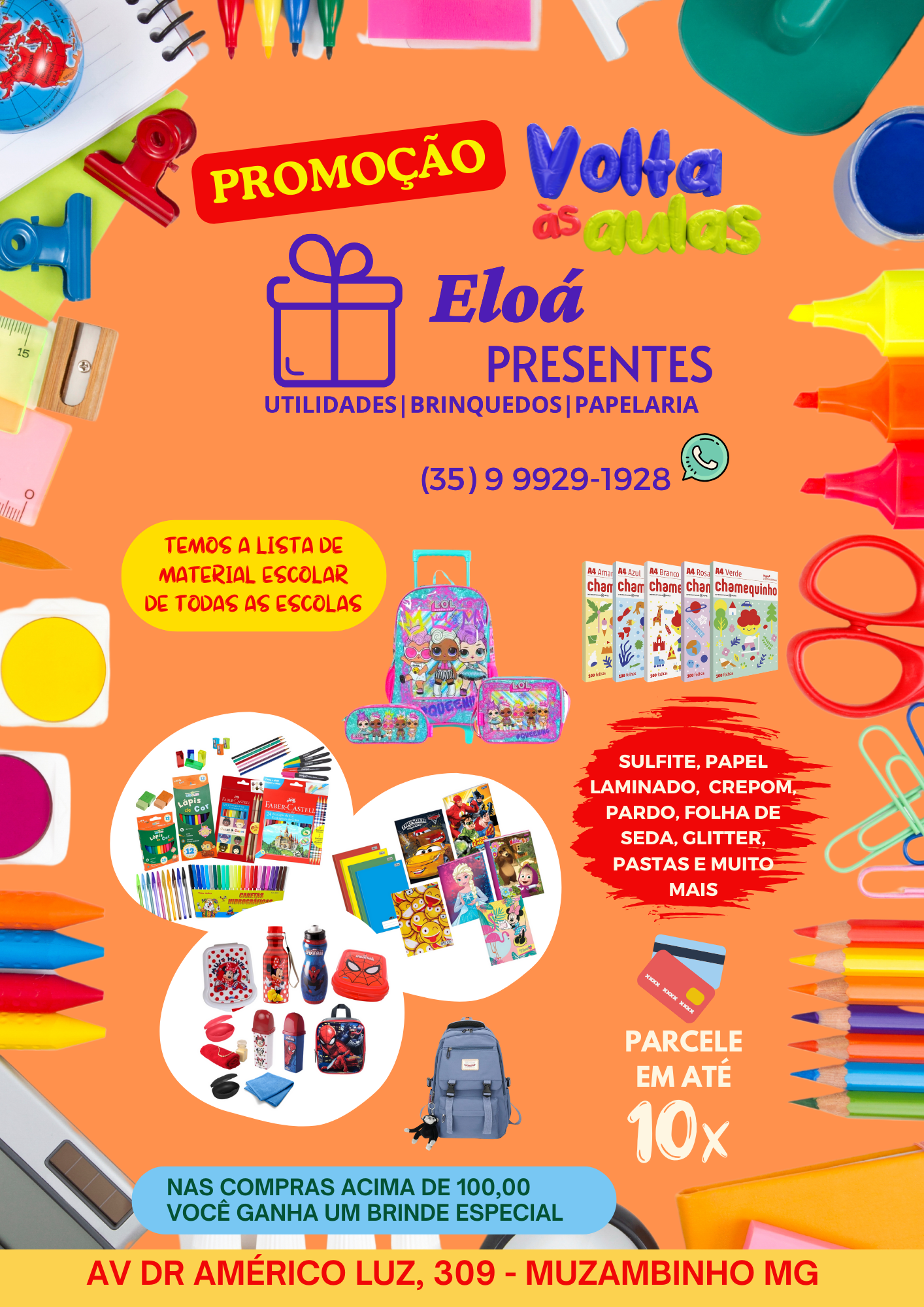 Mais Artigos BelezaDestaqueNossa CidadeParceiros Guaxu_Make inaugura em Muzambinho com grande variedade e preços imbatíveis DestaqueEsportesLazerParceiros Ainda dá tempo: presentes para crianças que nunca saem de moda Cozinha e CulináriaDestaqueEventos e FestasLazerNossa CidadeParceiros Sábado e Domingo no Pesqueiro Harmonia com muita diversão e sabor: Venha com os Amigos e Família DestaqueEducaçãoNossa CidadeParceirosPromoção Volta às Aulas na Eloá Presentes Redação22 de janeiro de 20241min0Temos a lista de material escolar de todas as ecolasNas compras acima de R$100 você ganha um brinde especial Parcele em até 10x (35)9 9929-1928 Av. Dr. Américo Luz, 309 – Centro Post Views: 584 alunoCompraEscolaLojamaterialpromoção