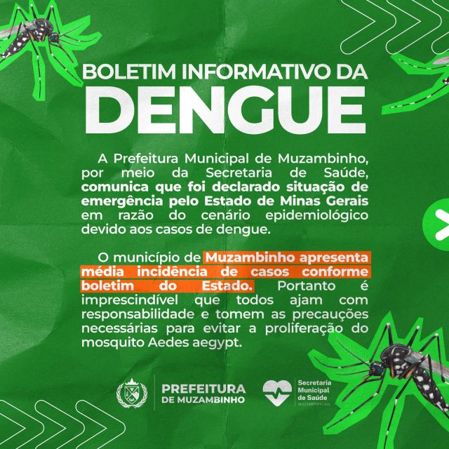 A Prefeitura Municipal de Muzambinho por meio da Secretaria de Saúde comunica que foi declarado situação de emergência pelo Estado de Minas Gerais em razão do cenário epidemiológico aos casos de dengue.