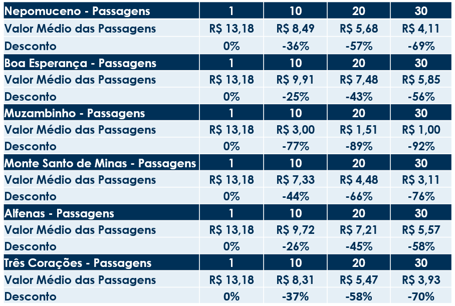 Ao atingir a 30ª passagem no mês, a tarifa mínima será cobrada em todas as passagens adicionais até o final do respectivo mês.