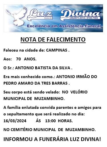 Mais Artigos DestaqueObituário Faleceu aos 63 anos o Sr. José Maria Magalhães DestaqueNossa CidadeParceiros Sicredi celebra cinco anos em Muzambinho com investimentos sociais e crescimento conjunto DestaqueLazerParceiros “Avatar: Fogo e Cinzas” lidera a nova programação no Cine14BisDestaqueObituárioFaleceu aos 70 anos o Sr. Antônio Batista da Silva Redação16 de março de 20241min0Informou a Funerária Luz DivinaA família enlutada, nossos sinceros sentimentos de pesares, que Deus os abençoe e conforte. Post Views: 874EnterroFuneráriaLuz DivinamorteobituárioSepultamentoVelório