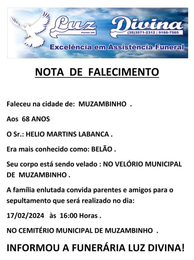 Mais Artigos DestaquePrevisão do Tempo Mais de 700 cidades mineiras estão em alerta de perigo para chuvas intensas; Muzambinho está na lista DestaqueEconomiaPolítica Governo prevê multa de até R$ 500 milhões por aumento abusivo de combustíveis AgronegócioDestaqueEventos e Festas Mudanças no clima levam cafeicultores a buscar tecnologia e dados na Femagri 2026DestaqueObituárioFaleceu aos 68 anos o Sr. Hélio Martins Labanca Redação17 de março de 20241min0Informou a Funerária Luz DivinaA família enlutada, nossos sinceros sentimentos de pesares, que Deus os abençoe e conforte. Post Views: 1.160EnterroFuneráriaLuz DivinamorteobituárioSepultamentoVelório