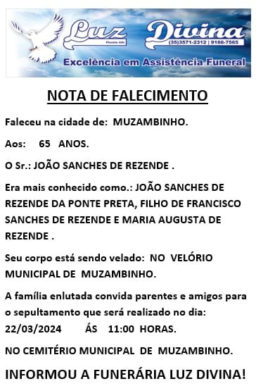 Mais Artigos DestaqueMensagens Feliz Ano Novo! Que 2026 seja de novas conquistas e boas notícias DestaqueNosso EstadoPrevisão do Tempo Mais de 500 cidades mineiras estão em alerta para tempestade com ventania e granizo DestaqueExecutivoNossa Cidade Atenção moradores: coleta de lixo muda no feriado de Ano Novo em MuzambinhoDestaqueObituárioFaleceu aos 65 anos, o Sr. João Sanches de Rezende Redação22 de março de 20241min0Informou a Funerária Luz DivinaA família enlutada, nossos sinceros sentimentos de pesares, que Deus os abençoe e conforte. Post Views: 652EnterroFuneráriaLuz DivinamorteobituárioSepultamentoVelório