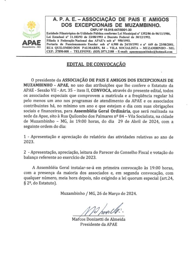 APAE – Edital de Convocação para Assembléia Geral Ordinária.
