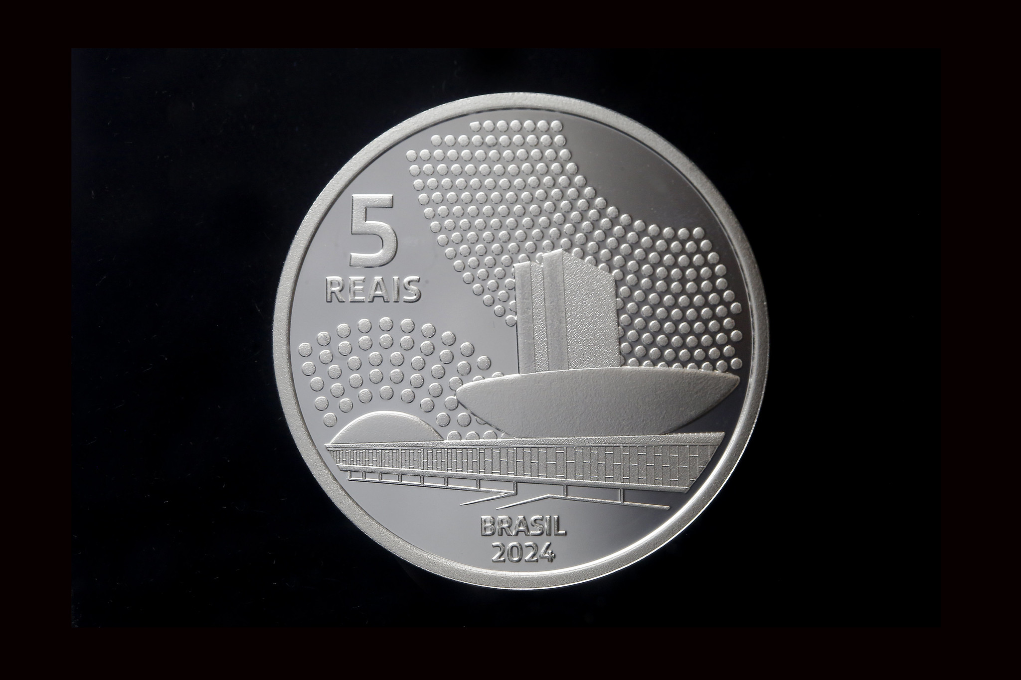 O reverso da moeda conta com a ilustração do Palácio do Congresso Nacional, em Brasília. Estão gravadas, ainda, as seguintes legendas: “BRASIL”, “2024” e “5 REAIS”.