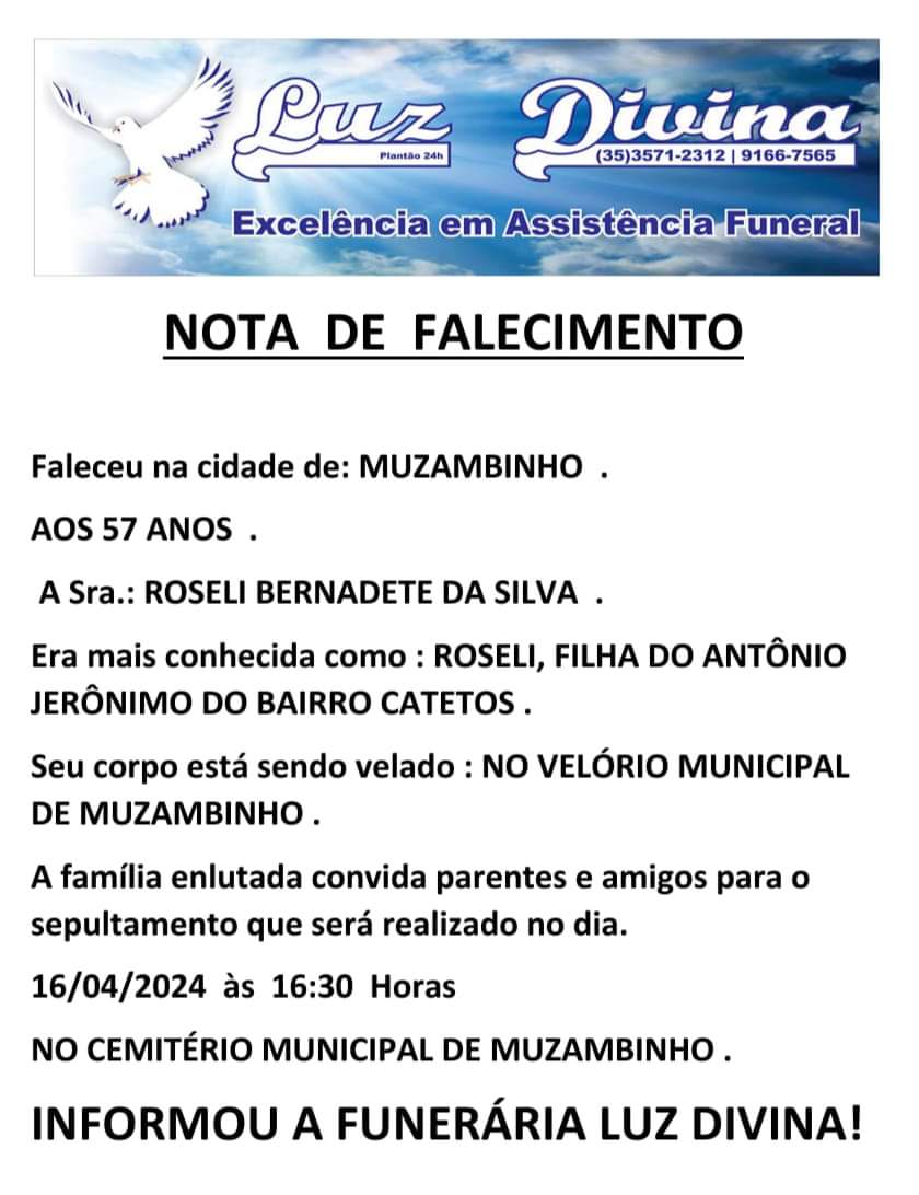 Mais Artigos DestaqueMensagens O Muzambinho.com deseja um Feliz Natal a todos os nossos internautas DestaqueEventos e FestasLazerNossa CidadeParceiros Sagrada Familia 11 anos – 20/12/25 DestaqueEconomiaPolítica Consumidor pagará menos na conta de luz em janeiro; saiba por quêDestaqueObituárioFaleceu aos 57 anos, a Sra. Roseli Bernadete da Silva Redação16 de abril de 20241min0Informou a Funerária Luz DivinaA família enlutada, nossos sinceros sentimentos de pesares, que Deus os abençoe e conforte. Post Views: 1.014EnterroFuneráriaLuz DivinamorteobituárioSepultamentoVelório