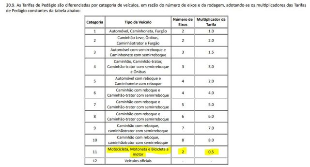 Já dos usuários de Motos será cobrado 50% (cinquenta por cento) do valor cobrado de veículos (categoria 1 – veículos automotores leves com dois eixos e rodagem simples), as Motos não se enquadram no DUF.