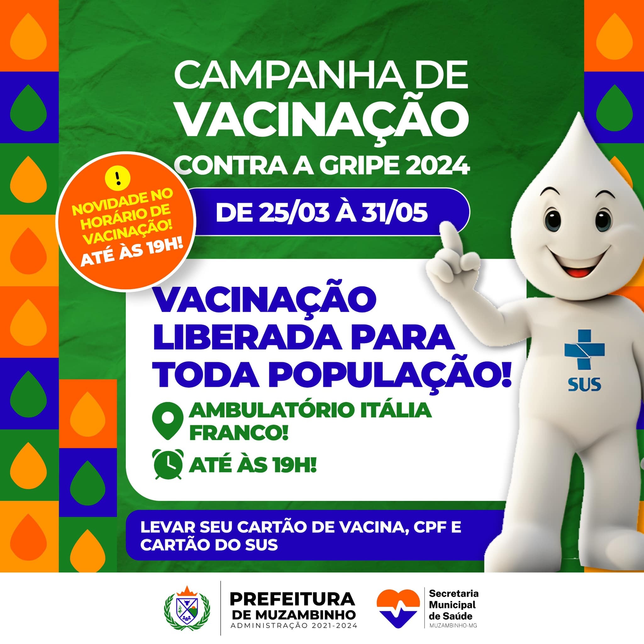 Vacinação liberada para toda a população muzambinhense! Compareça ao ambulatório Itália Franco com o seu cartão de vacinação, CPF e o cartão do SUS.