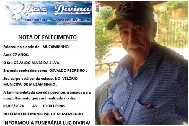 Mais Artigos DestaqueEventos e Festas Venha participar da Feira Noturna de Muzambinho nesta sexta-feira, 24/04 DestaqueModa Felinju 2026: Juruaia reafirma força do polo de moda íntima em sua 29ª edição DestaqueEconomia INSS paga 13º salário a aposentados e pensionistas a partir desta sexta (24)DestaqueObituárioFaleceu aos 77 anos, o Sr. Osvaldo Alves da Silva Redação9 de maio de 20241min0Informou a Funerária Luz DivinaA família enlutada, nossos sinceros sentimentos de pesares, que Deus os abençoe e conforte. Post Views: 489EnterroFuneráriaLuz DivinamorteobituárioSepultamentoVelório