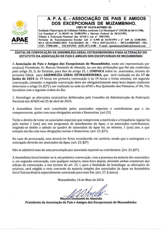 Mais Artigos Cozinha e CulináriaDestaqueNossa CidadeParceiros Queijos Musa, sabor que dá vontade de cortar mais um pedaço! DestaqueNossa CidadeSaúde Santa Casa de Muzambinho realizou 2.941 atendimentos no pronto-socorro em março de 2026 DestaqueObituário Faleceu aos 92 anos a Sra. Maria de Oliveira RamosDestaqueNossa CidadeParceirosAPAE Muzambinho convoca Assembleia Geral para Alteração de Estatuto Redação15 de maio de 20241min0Assembleia será no dia 17 de Junho de 2024, às 19h em primeira convocação e 19h30 em segunda convocação. Post Views: 741APAEAssembléiaEstatuto