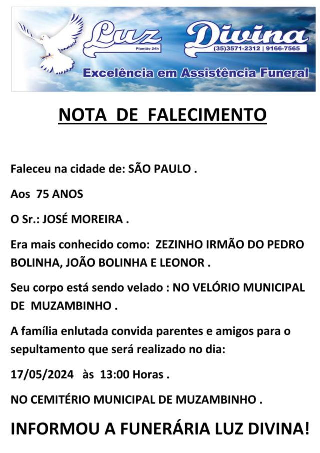 Mais Artigos Cozinha e CulináriaDestaqueNossa CidadeParceiros Domingo combina com pizza! Hoje é dia de aproveitar! DestaqueEventos e FestasLegislativoNossa Cidade Câmara de Muzambinho homenageia mulheres trabalhadoras em sessão solene Cozinha e CulináriaDestaqueNossa CidadeParceiros Queijos Recheados e Trufados Musa: sabor surpreendente e apresentação que conquista o clienteDestaqueObituárioFaleceu aos 75 anos, o Sr. José Moreira Redação17 de maio de 20241min0Informou a Funerária Luz DivinaA família enlutada, nossos sinceros sentimentos de pesares, que Deus os abençoe e conforte. Post Views: 506EnterroFuneráriaLuz DivinamorteobituárioSepultamentoVelório