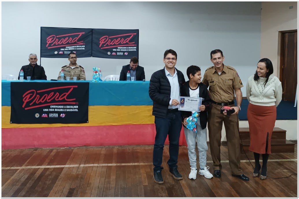 O Tenente Maia, responsável pelo comando da Polícia Militar em Muzambinho, destacou a importância da parceria entre as instituições de ensino, os professores, os políticos locais e as lideranças ligadas à educação para o sucesso do programa. Este ano, o evento ocorreu em duas etapas, contemplando os alunos dos quintos e sétimos anos. A cerimônia não apenas premiou as melhores redações, mas também sorteou três celulares. Ao final, todos se uniram para entoar a música tema do programa, marcando o encerramento com um espírito de união e comprometimento com um futuro livre das drogas.