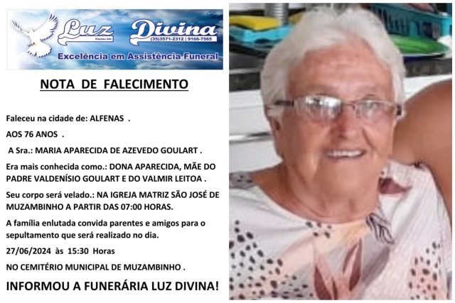 Mais Artigos DestaqueEventos e Festas Venha participar da Feira Noturna de Muzambinho nesta sexta-feira, 24/04 DestaqueModa Felinju 2026: Juruaia reafirma força do polo de moda íntima em sua 29ª edição DestaqueEconomia INSS paga 13º salário a aposentados e pensionistas a partir desta sexta (24)DestaqueObituárioFaleceu aos 76 anos, a Sra. Maria Aparecida de Azevedo Goulart Redação27 de junho de 20241min0Informou a Funerária Luz DivinaA família enlutada, nossos sinceros sentimentos de pesares, que Deus os abençoe e conforte. Post Views: 757EnterroFuneráriaLuz DivinamorteobituárioSepultamentoVelório