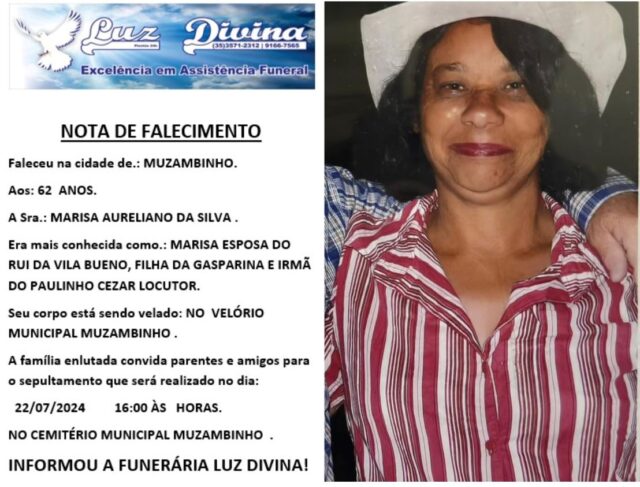 Mais Artigos DestaqueLegislativoNossa CidadeParceiros Parlamento Jovem 2026 é lançado em Muzambinho com foco na inclusão e cidadania DestaqueLazerParceiros Cine14Bis: Confira a Programação Semanal DestaqueDiversos Saiba o significado da Páscoa e por que ela acontece em datas diferentes a cada anoDestaqueObituárioFaleceu aos 62 anos, a Sra. Marisa Aureliano da SIlva Redação22 de julho de 20241min0Informou a Funerária Luz DivinaA família enlutada, nossos sinceros sentimentos de pesares, que Deus os abençoe e conforte. Post Views: 703EnterroFuneráriaLuz DivinamorteobituárioSepultamentoVelório