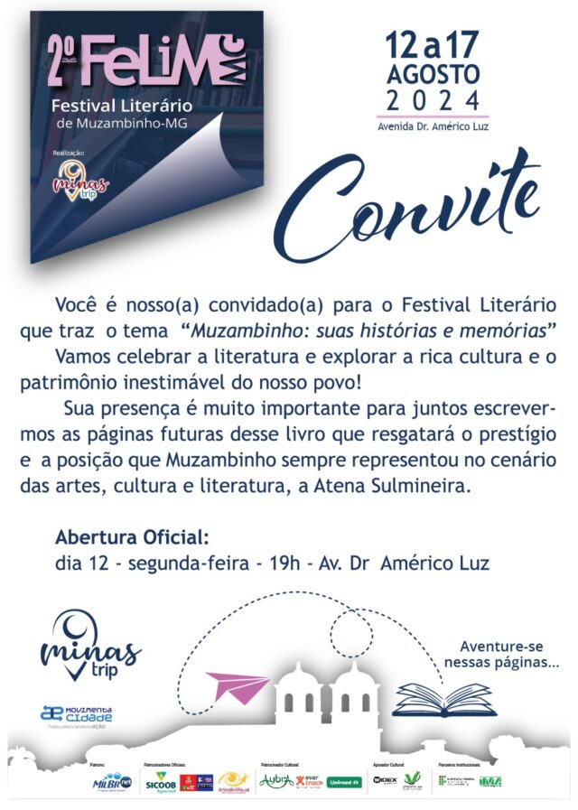 Mais Artigos AgronegócioDestaqueEventos e Festas Mudanças no clima levam cafeicultores a buscar tecnologia e dados na Femagri 2026 DestaqueParceiros Faz de Conta Papelaria & Presentes lança promoção especial com descontos imperdíveis no Dia do Consumidor DestaqueLazerParceiros Cine14Bis: Confira a Programação SemanalCulturaDestaqueNossa CidadeParceirosVem aí… Felim 2024 – Aventure-se nessas páginas… Redação2 de agosto de 20241min02º Festival Literário de Muzambinho-MG - "Muzambinho: Suas histórias e memórias" Post Views: 640FELIMFestivalhistóriasLiterárioLivroMemórias