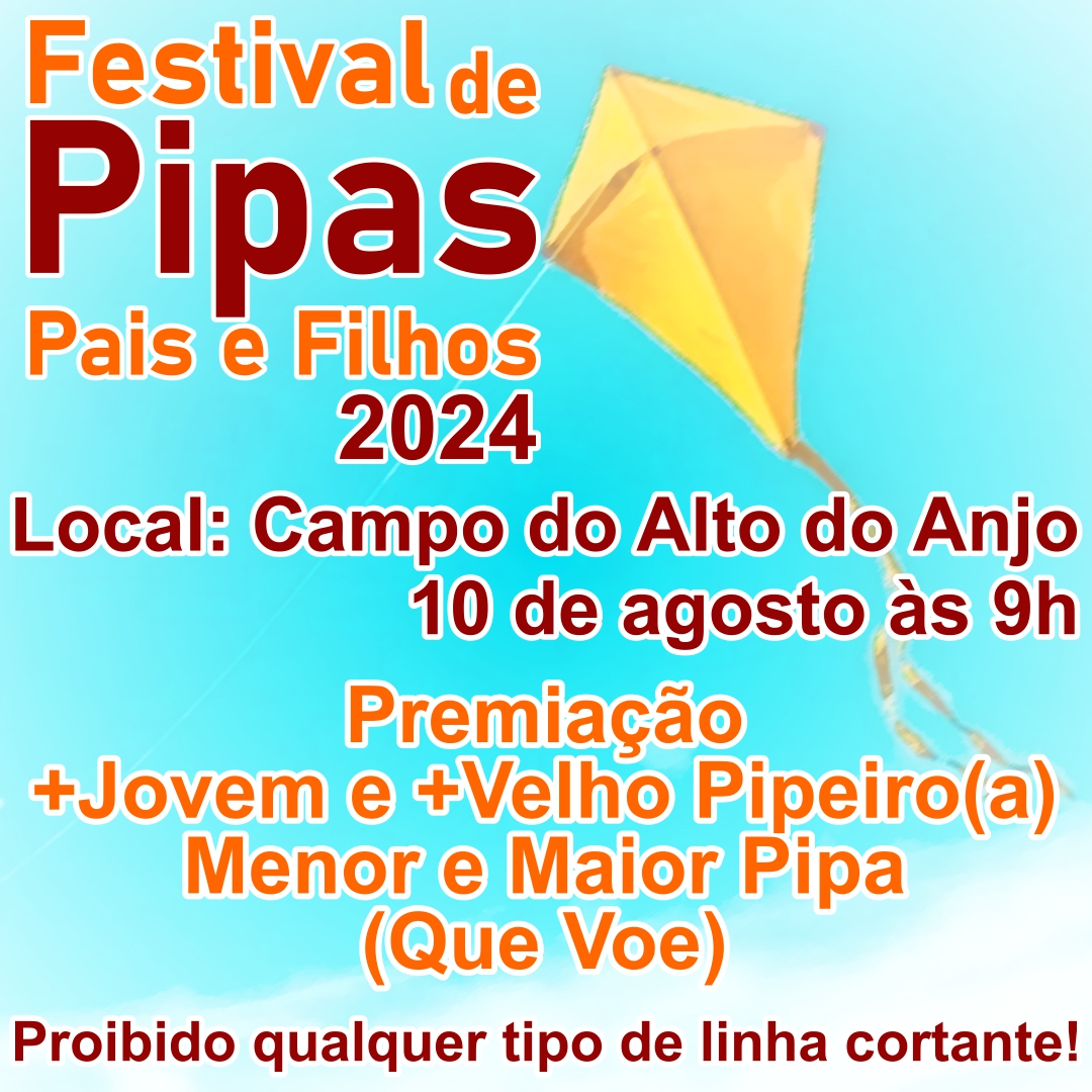 Serão premiados o pipeiro mais jovem e o mais velho, a maior e menor pipa (que voe). Venha participar deste festival com toda a família.