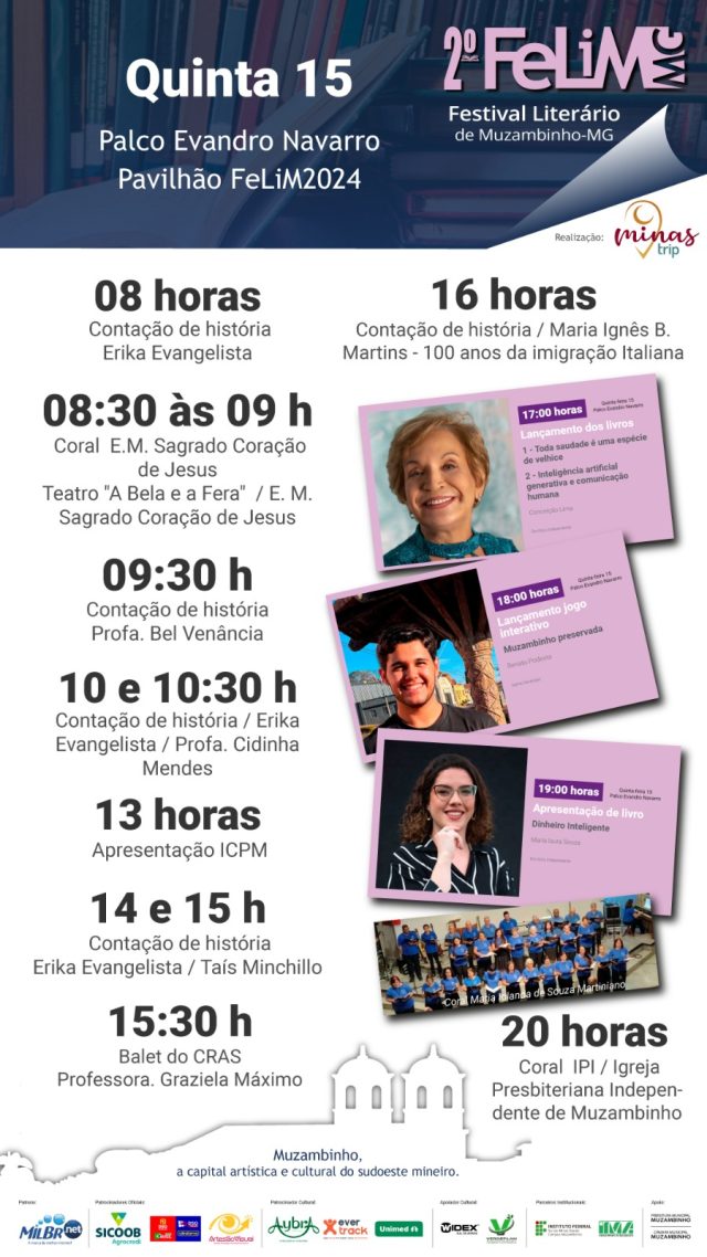 Mais Artigos DestaqueEconomia Governo antecipa pagamento do 13º salário do INSS para abril e maio; veja datas DestaqueEventos e Festas Venha participar da Feira Noturna de Muzambinho nesta sexta-feira, 20/03 DestaquePrevisão do Tempo Previsão do tempo: frente fria e calor elevam risco de temporais no paísCulturaDestaqueEventos e FestasNossa CidadeParceirosAbertura Hoje, 12/08, confira Programação FELIM 2024 – De 12 a 16/08/24 Redação12 de agosto de 20241min0Uma semana inteira de histórias e memórias, vamos celebrar a cultura e o patrimônio de nossa cidade. . Post Views: 653CulturaFELIMhistóriasMemóriasPatrimônio
