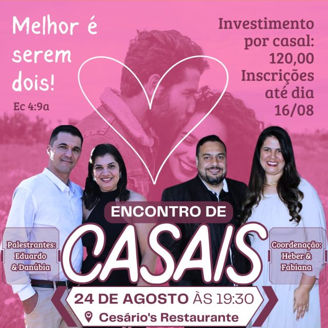 O Encontro de 2024 foi realizado neste sábado, 24/08, no Restaurante Cesário´s, que após Cânticos, Dinâmica o Pr. Eduardo trouxe uma mensagem aos casais presente, em sua 13ª edição o Encontro reuniu mais de 50 Casais que além da mensagem desfrutaram de momentos românticos e de confraternização e um delicioso jantar servido com a qualidade do Restaurante Cesário´s.