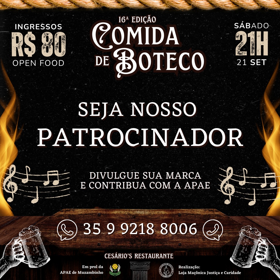 Mais Artigos DestaqueEventos e FestasNossa CidadeParceiros ObaOba Samba House agita o Sagrada Família – Bar do Edmar no dia 20 de dezembro DestaqueNosso EstadoPrevisão do Tempo Mais de 95% das cidades de Minas estão em alerta para chuvas intensas até quinta; veja lista DestaqueDiversosNossa Cidade Correios divulgam esquema especial de funcionamento no fim de anoCozinha e CulináriaDestaqueEventos e FestasNossa CidadeParceirosVem aí a 16a. Comida de Boteco em prol da APAE de Muzambinho Redação15 de setembro de 20241min0Realização Loja Maçônica Justiça e CaridadeInformações pelo whatsApp (35) 99218-8006 Post Views: 608APAEComida de Buteco