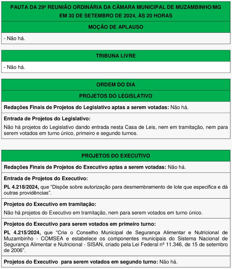 Confira a pauta da 29ª Reunião Ordinária de Vereadores em Muzambinho – 30/09/2024