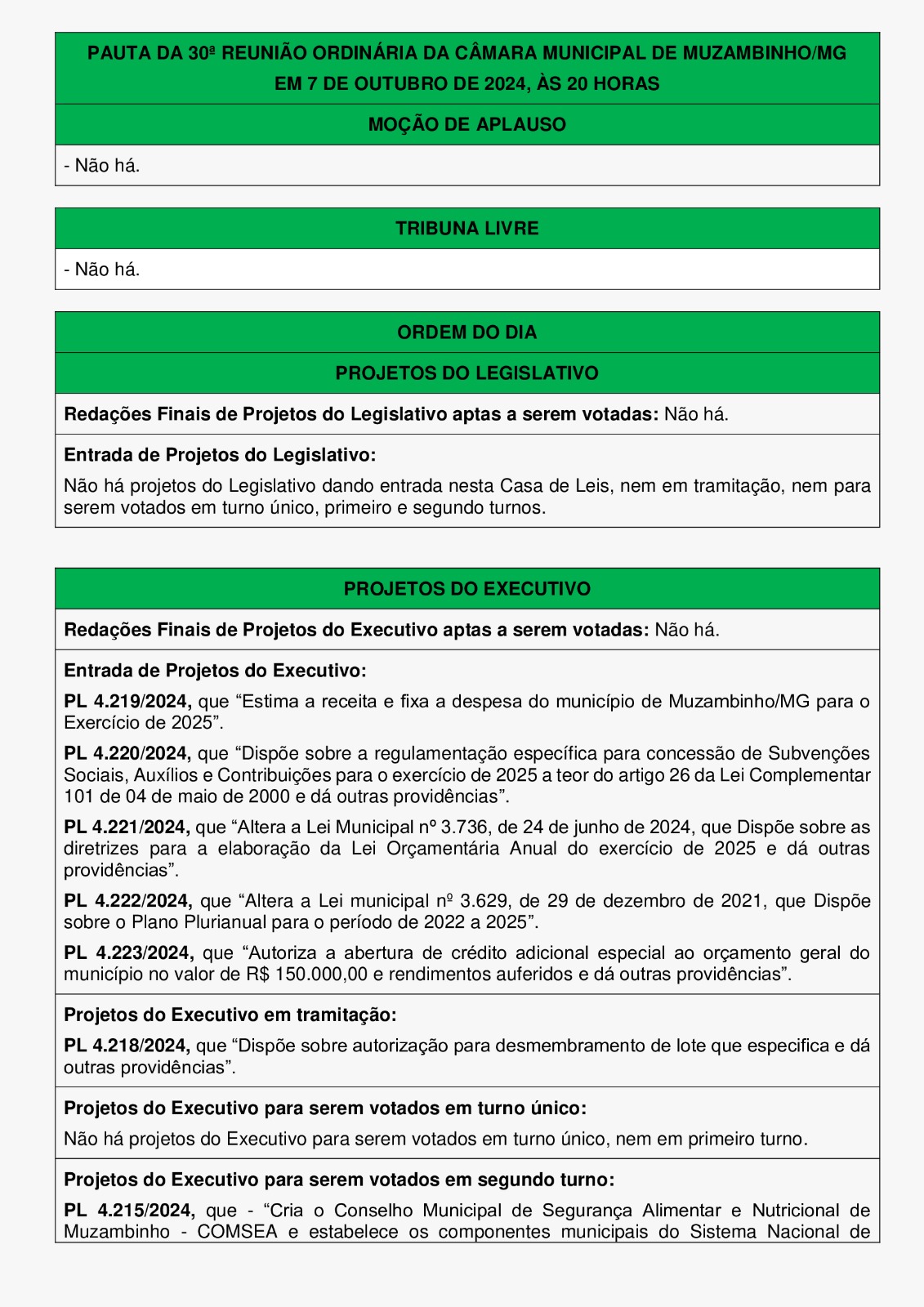 30ª Reunião Ordinária de Vereadores em Muzambinho – 07/10/2024