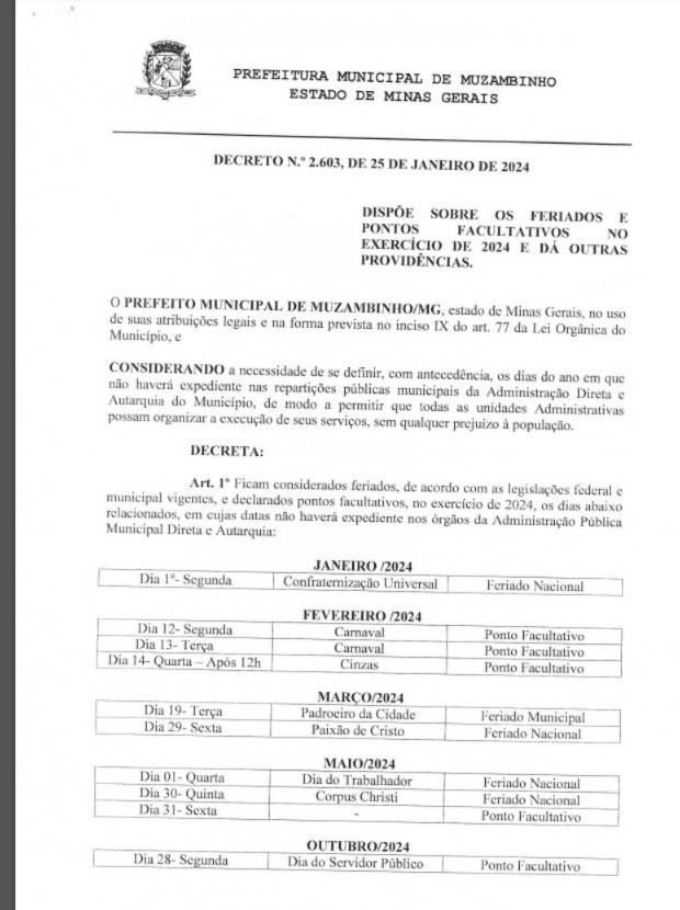Confira abaixo o decreto com os feriados e pontos facultativos em 2024: