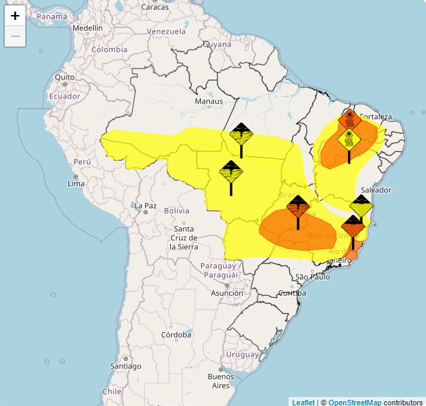 Há possibilidade de pancadas de chuva e trovoadas isoladas na região metropolitana da capital, Triângulo Mineiro, Alto Paranaíba, região Central de Minas, Oeste, Sudoeste e Noroeste mineiro, e Campo das Vertentes.