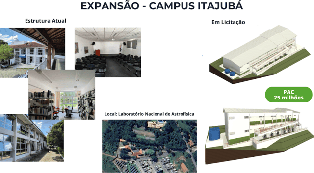 O imóvel cedido ao Instituto está localizado na entrada de Itajubá, em uma área de 7 mil m², e conta com dois prédios de três andares. Para a implantação do novo campus no local, o Governo Federal se comprometeu a destinar R$ 25 milhões. Desse montante, R$ 15 milhões serão investidos em obras, enquanto R$ 10 milhões financiarão a compra de equipamentos e mobiliário. No primeiro bimestre de 2025, já está previsto o início da construção de um novo bloco pedagógico com dez salas de aula.
