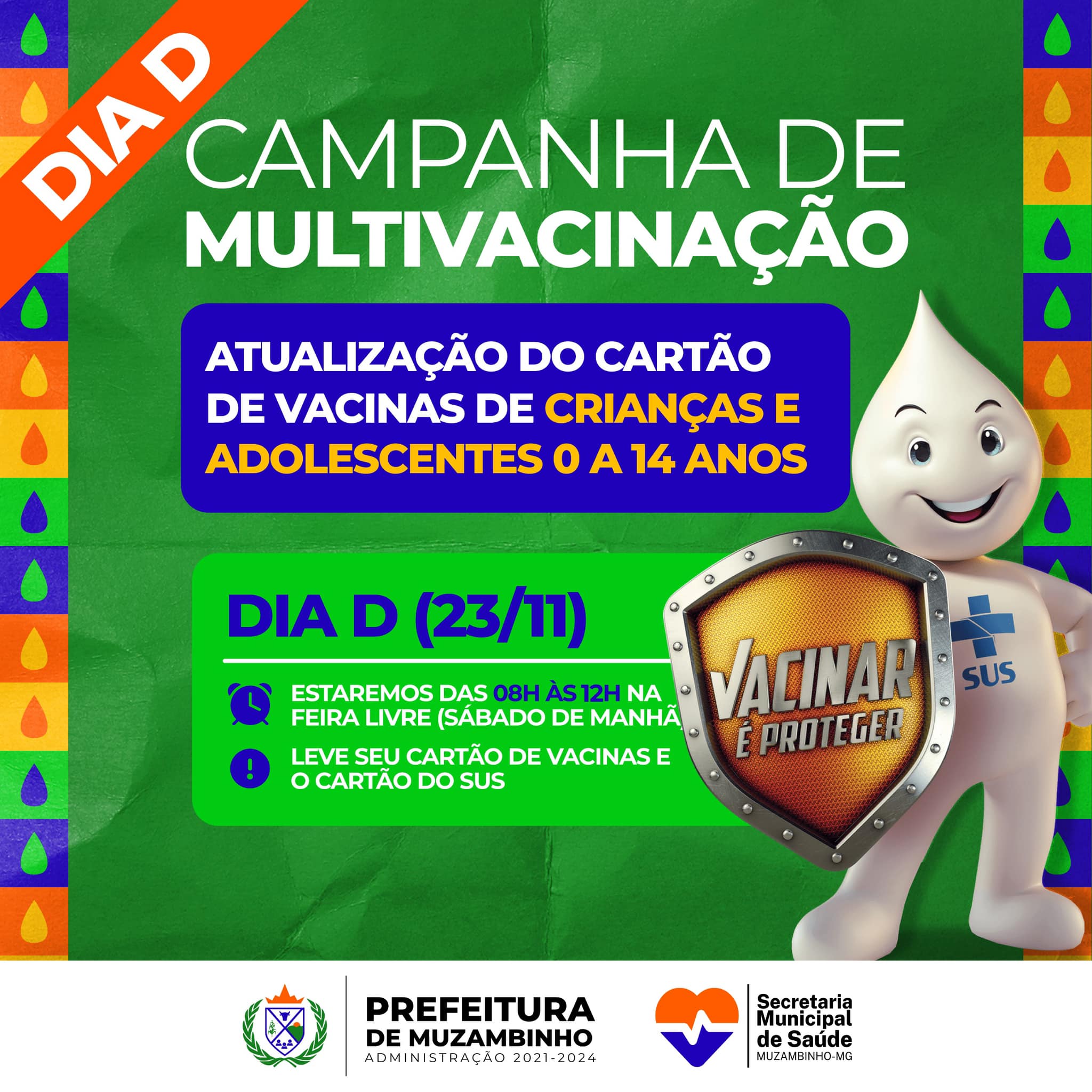 A Prefeitura de Muzambinho, por meio da Secretaria Municipal de Saúde, realizará neste sábado, 23 de novembro, o Dia D da Campanha de Multivacinação, destinada à atualização do cartão de vacinas de crianças e adolescentes com idades entre 0 e 14 anos.