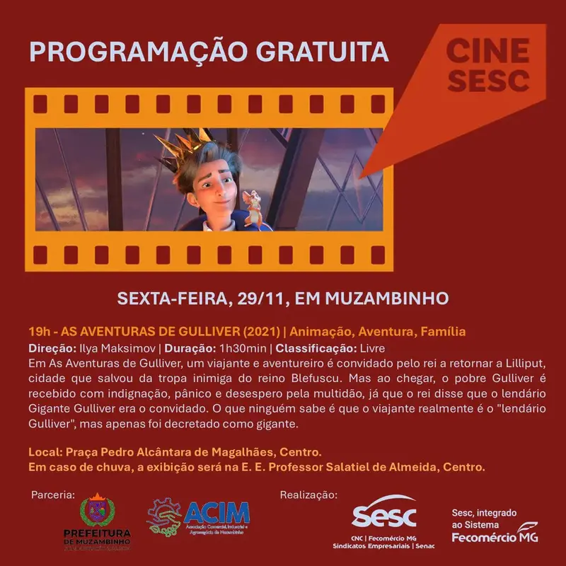 A exibição contará com o filme “As Aventuras de Gulliver” (2021), uma animação de aventura e família dirigida por Ilya Maksimov. Com duração de 1h30min e classificação livre, a história narra as peripécias de Gulliver, um viajante convidado pelo rei para retornar à cidade de Lilliput. Ele é celebrado como herói por salvar a cidade de uma tropa inimiga. Contudo, ao chegar, enfrenta pânico e desespero por ser considerado um gigante, embora, na realidade, seja um homem comum.