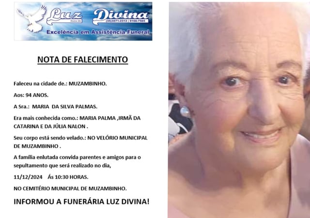 Mais Artigos DestaqueSaúde Sábado é Dia D da Campanha Nacional de Vacinação DestaqueLegislativoNossa CidadePolítica Confira as falas da 35ª Reunião Ordinária de Vereadores em Muzambinho – 13/10/2025 AgronegócioDestaque Café em Foco, 13/10/25, Cotações e Informações da Cafeicultura DestaqueObituárioFaleceu aos 94 anos a Sra. Maria da Silva Palmas Redação11 de dezembro de 20241min0Informou a Funerária Luz Divina A família enlutada, nossos sinceros sentimentos de pesares, que Deus os abençoe e conforte. Post Views: 243 EnterroFuneráriaLuz DivinamorteobituárioSepultamentoVelório
