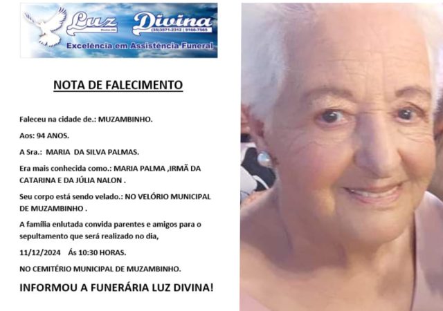 Mais Artigos DestaqueLegislativoNossa CidadePolítica Confira as falas da 44ª Reunião Ordinária de Vereadores em Muzambinho – 15/12/2025 DestaqueDiversosNossa CidadeNosso Estado Banda Municipal Santa Cecília se apresenta no Tribunal de Contas de Minas Gerais DestaqueObituário Faleceu aos 65 anos a Sra. Denise Aparecida Ribeiro FigueiredoDestaqueObituárioFaleceu aos 94 anos a Sra. Maria da Silva Palmas Redação11 de dezembro de 20241min0Informou a Funerária Luz DivinaA família enlutada, nossos sinceros sentimentos de pesares, que Deus os abençoe e conforte. Post Views: 293EnterroFuneráriaLuz DivinamorteobituárioSepultamentoVelório