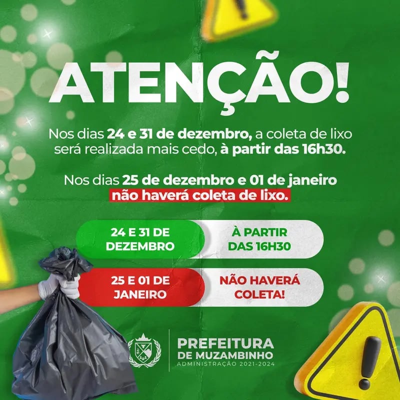 A Prefeitura de Muzambinho informa mudanças nos horários e datas do serviço de coleta de lixo durante os feriados de Natal e Ano Novo. A medida visa adequar os serviços às festividades, garantindo a eficiência no atendimento.
