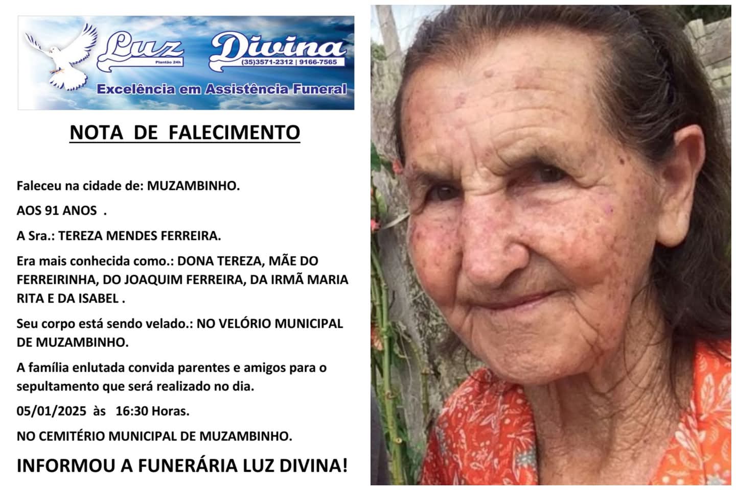 Mais Artigos DestaqueEsportesNossa Cidade Muzambinho é campeã da Fase Zonal A do Campeonato Mineiro de Handebol Feminino 2025 DestaqueEventos e FestasNossa Cidade VÍDEO: Aos 94 anos, Zito Martins participará do Encontro de Carros Antigos de Muzambinho DestaqueExecutivoNossa Cidade Muzambinho recebe novo ônibus do programa Transporta SUS DestaqueObituárioFaleceu aos 91 anos a Sra. Tereza Mendes Ferreira Redação5 de janeiro de 20251min0Informou a Funerária Luz Divina A família enlutada, nossos sinceros sentimentos de pesares, que Deus os abençoe e conforte. Post Views: 248 EnterroFuneráriaLuz DivinamorteobituárioSepultamentoVelório