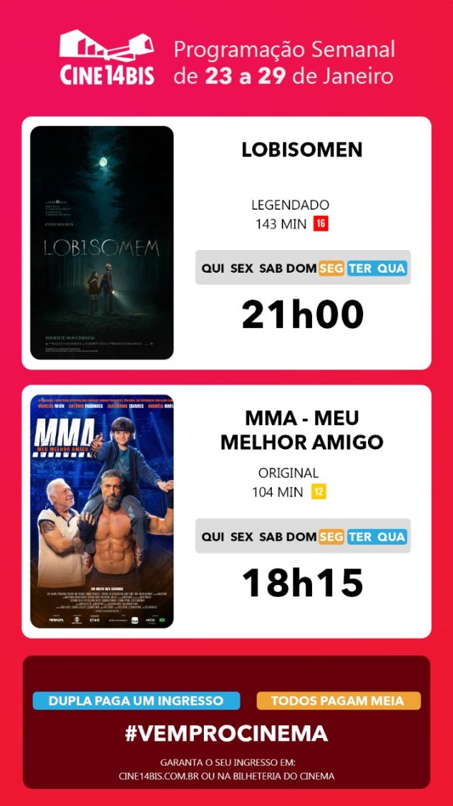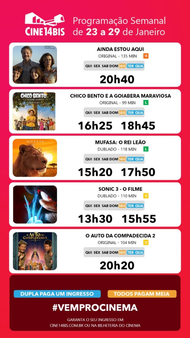 A programação completa e os horários das sessões podem ser conferidos no site oficial do Cine 14 Bis: www.cine14bis.com.br.