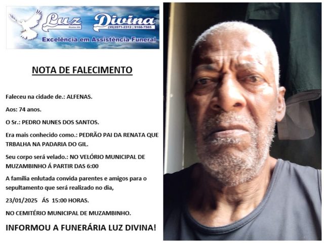 Mais Artigos DestaquePolítica Conheça o processo de verificação da situação eleitoral no Brasil DestaqueObituário Faleceu aos 65 anos o Sr. Pedro Silva Rita Magalhães AgronegócioDestaque Café em Foco, 17/03/26, Cotações e Informações da CafeiculturaDestaqueObituárioFaleceu aos 75 anos o Sr. Pedro Nunes dos Santos Redação23 de janeiro de 20251min0Informou a Funerária Luz DivinaA família enlutada, nossos sinceros sentimentos de pesares, que Deus os abençoe e conforte. Post Views: 784EnterroFuneráriaLuz DivinamorteobituárioSepultamentoVelório