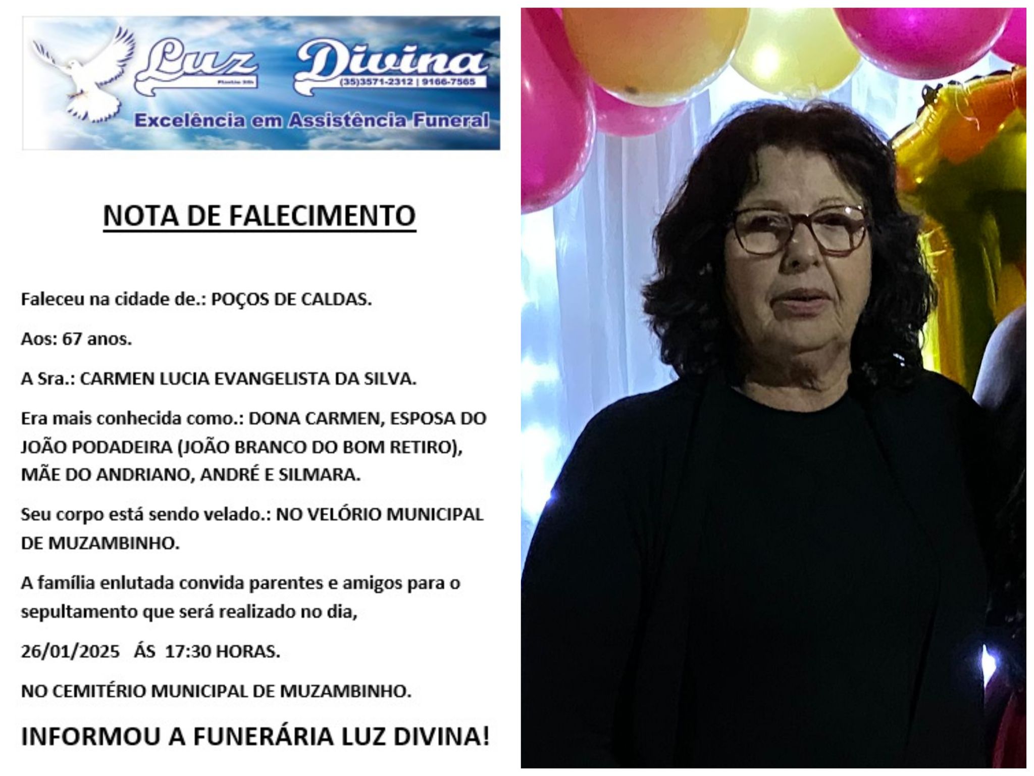 Mais Artigos DestaqueObituário Faleceu aos 67 anos o Sr. José Pedro de Melo DestaqueEsportesNossa Cidade O esporte vai tomar conta de Muzambinho com as Olimpíadas da SELCT DestaqueExecutivoNossa Cidade Atenção moradores: coleta de lixo muda nos feriados de fim de ano em MuzambinhoDestaqueObituárioFaleceu aos 67 anos, a Sra. Carmen Lucia Evangelista da Silva Redação26 de janeiro de 20251min0Informou a Funerária Luz DivinaA família enlutada, nossos sinceros sentimentos de pesares, que Deus os abençoe e conforte. Post Views: 343EnterroFuneráriaLuz DivinamorteobituárioSepultamentoVelório