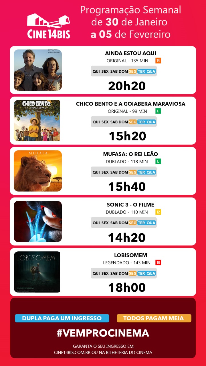 Ingressos: Consulte valores e promoções no site www.cine14bis.com.br ou no aplicativo oficial.
