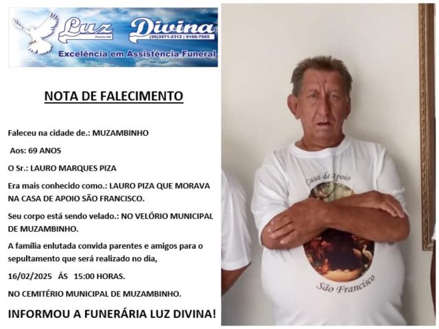 Mais Artigos AgronegócioDestaqueEducaçãoNossa CidadeParceiros Agricultura Familiar: Encontro em Muzambinho articula venda de produtos locais para merenda escolar CulturaDestaqueNossa CidadeParceiros Motriz apresenta nova diretoria e reforça compromisso com a cultura e inclusão em Muzambinho AniversáriosDestaque Quatro décadas de história: Fabrício Santos Ritá celebra 40 anos entre amigosDestaqueObituárioFaleceu aos 69 anos o Sr. Lauro Marques Piza Redação16 de fevereiro de 20251min0Informou a Funerária Luz DivinaA família enlutada, nossos sinceros sentimentos de pesares, que Deus os abençoe e conforte. Post Views: 341EnterroFuneráriaLuz DivinamorteobituárioSepultamentoVelório
