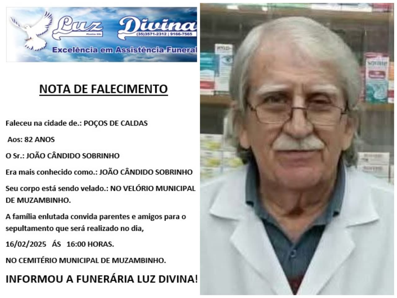 Mais Artigos DestaqueObituário Faleceu aos 43 anos o Sr. Maurício Roberto dos Santos DestaqueDiversos ONU confirma 2025 como terceiro ano mais quente da história DestaqueEsportesNossa Cidade Campeonato Municipal de Futebol de Campo volta a agitar Muzambinho neste fim de semanaDestaqueObituárioFaleceu aos 82 anos o Sr. João Cândido Sobrinho Redação16 de fevereiro de 20251min0Informou a Funerária Luz DivinaA família enlutada, nossos sinceros sentimentos de pesares, que Deus os abençoe e conforte. Post Views: 307EnterroFuneráriaLuz DivinamorteobituárioSepultamentoVelório