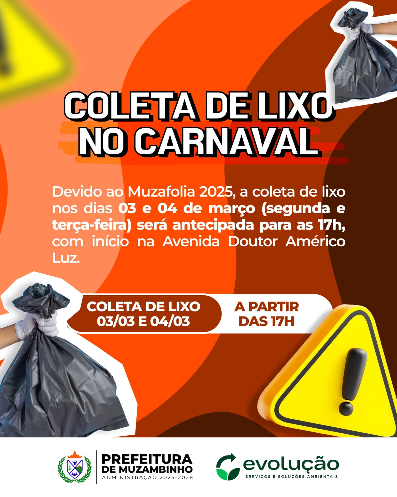 Devido ao Muzafolia 2025, a coleta de lixo nos dias 03 e 04 de março (segunda e terça-feira de Carnaval) será antecipada para as 17h. O serviço terá início na Avenida Doutor Américo Luz e seguirá seu percurso habitual.