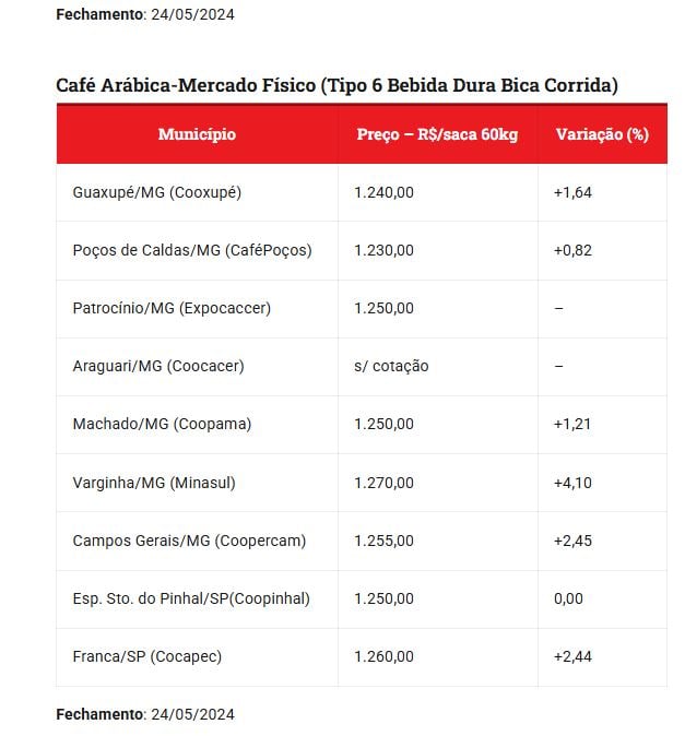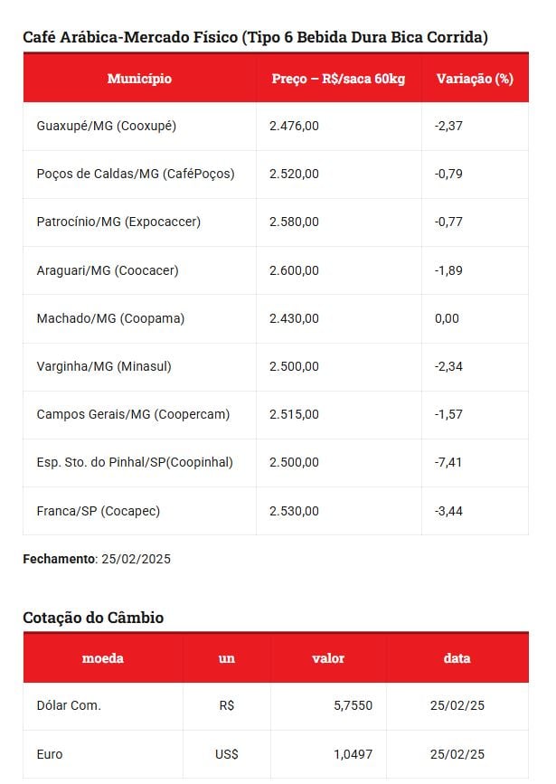 No ano seguinte, em maio de 2024, o preço retornou ao patamar de R$ 1.240,00, demonstrando uma recuperação do mercado. Já em dezembro de 2024, uma nova alta elevou o preço para R$ 2.154,00, seguido de um aumento em fevereiro de 2025, quando a saca de café alcançou o valor de R$ 2.476,00.
