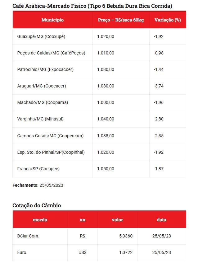 Entre fevereiro de 2020 e maio de 2022, houve um salto no preço do café, que passou para R$ 1.240,00, indicando um período de forte valorização. No entanto, em maio de 2023, observou-se uma leve queda, com a saca sendo negociada a R$ 1.020,00. Esse recuo pode ter sido influenciado por fatores sazonais, oscilação da oferta e demanda global ou variações cambiais.