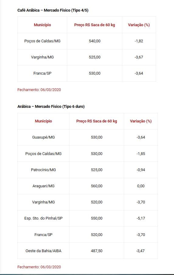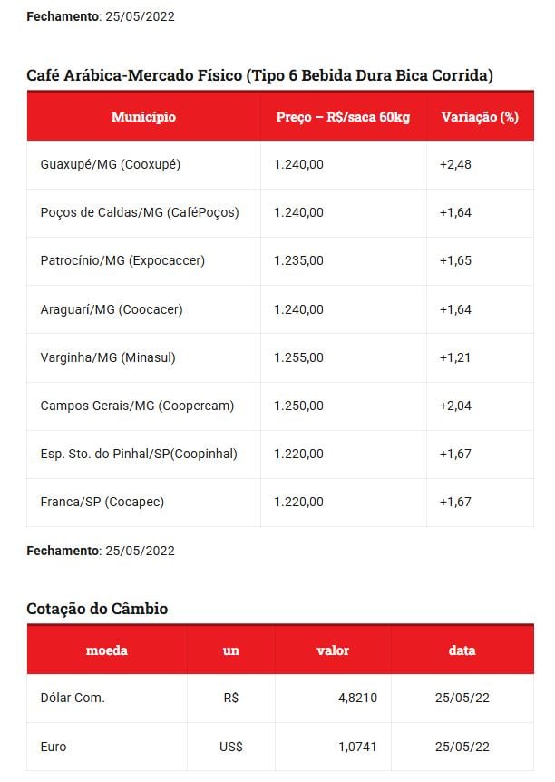 O muzambinho.com mantém periodicamente os preços de comercialização de Café em nossa coluna Agronegócio/Café em Foco, confira abaixo a evolução de Preços: