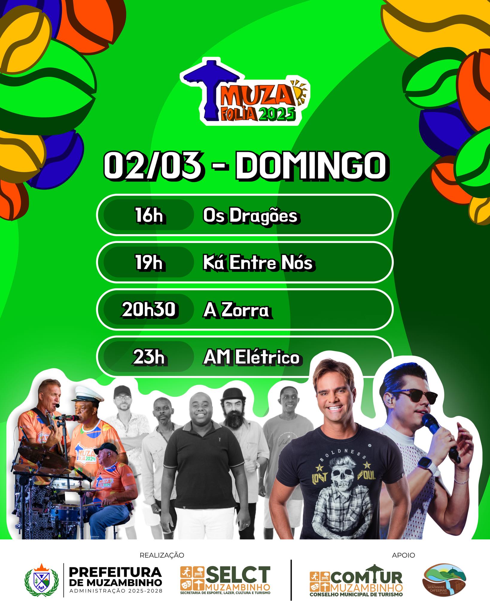A espera acabou! O MuzaFolia 2025 tem início nesta sexta-feira (28), trazendo uma programação repleta de shows e animação para os foliões de Muzambinho e região. Com uma seleção especial de artistas e bandas, o carnaval promete ser inesquecível, com opções para todos os gostos musicais.