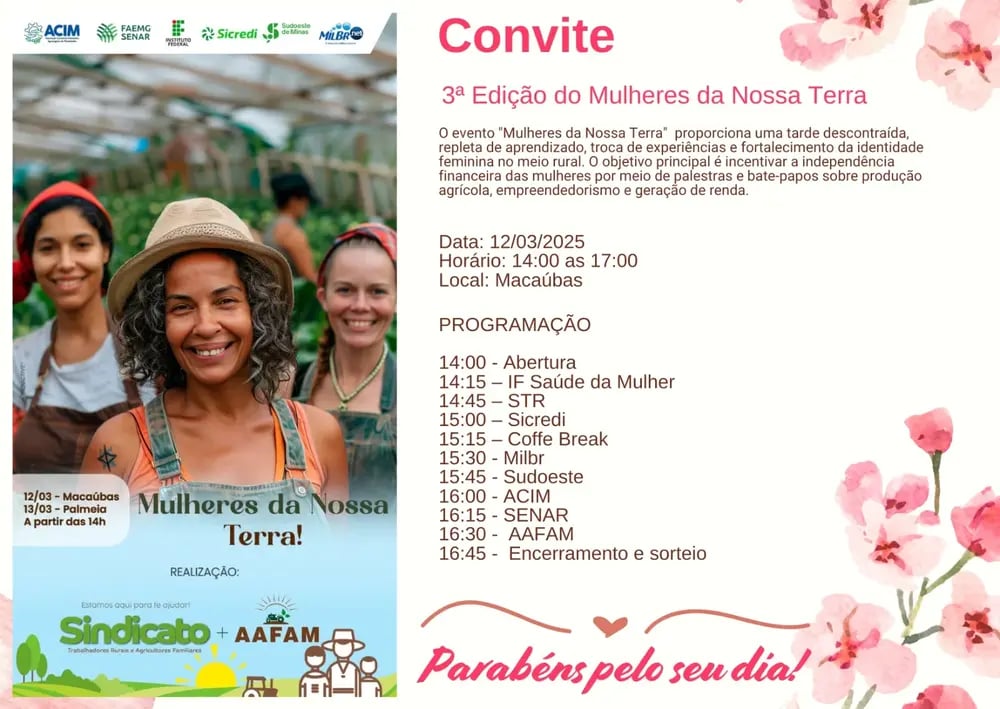 No dia 12 de março de 2025, a comunidade de Macaúbas, em Muzambinho, será palco da 3ª edição do evento “Mulheres da Nossa Terra”. A iniciativa busca fortalecer a identidade feminina no meio rural, proporcionando uma tarde de aprendizado, troca de experiências e incentivo à independência financeira das mulheres do campo.