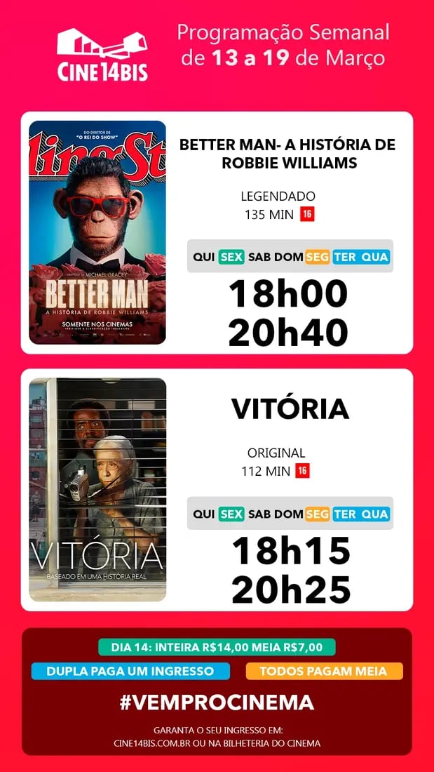 O Cine14Bis mantém sua promoção especial de sexta-feira, com ingressos a R$ 14,00 (inteira) e R$ 7,00 (meia). Os ingressos podem ser adquiridos pelo site www.cine14bis.com.br ou pelo app Cine14Bis, disponível para download.