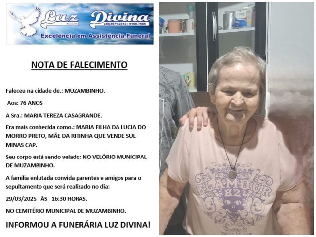 Mais Artigos DestaqueObituário Faleceu aos 92 anos a Sra. Maria de Oliveira Ramos DestaqueObituário Faleceu aos 35 anos Fernanda Alexandra da Cruz DestaqueObituário Faleceu aos 82 anos o Sr. Antoninho Da Rocha MarmoObituárioFaleceu aos 76 anos a Sra. Maria Tereza Casagrande Redação29 de março de 20251min0Informou a Funerária Luz DivinaA família enlutada, nossos sinceros sentimentos de pesares, que Deus os abençoe e conforte. Post Views: 353EnterroFuneráriaLuz DivinamorteobituárioSepultamentoVelório
