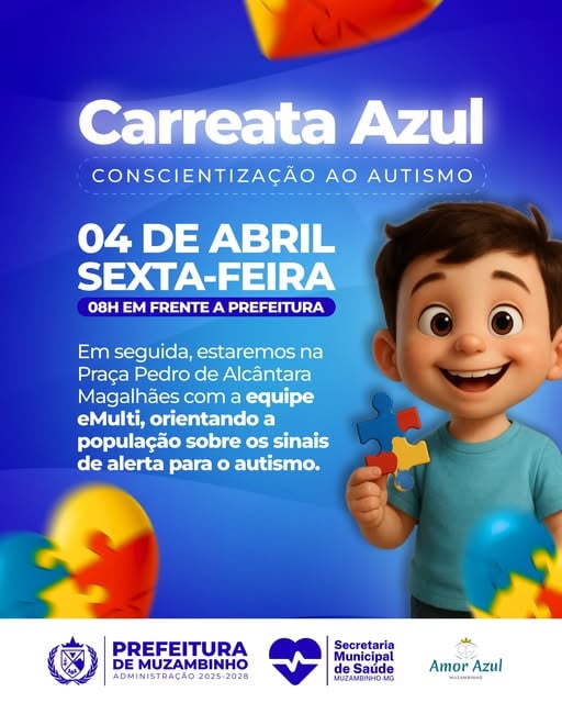 Muzambinho se une em uma importante ação de conscientização sobre o autismo com a realização da Carreata Azul nesta sexta-feira, 04 de abril. O evento tem início às 08h, com saída em frente à Prefeitura, e será conduzido de forma respeitosa, sem buzinas, apenas com o pisca-alerta ligado, em atenção às pessoas autistas.